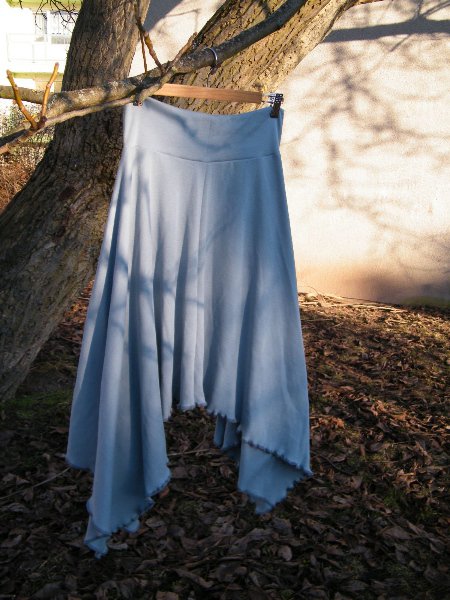 Délka sukně od pasu 70 cm, délka od pasu k bočnímu cípu 94 cm.