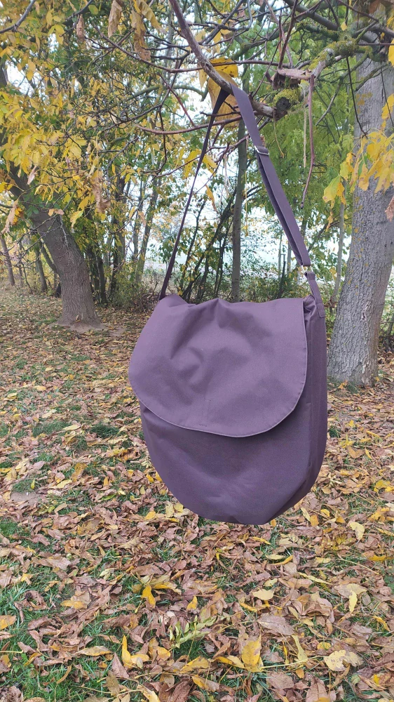 Polokruhovitý tvar tašky, která se zapíná na tkaničku s brzdičkou a na klopu se suchým zipem.