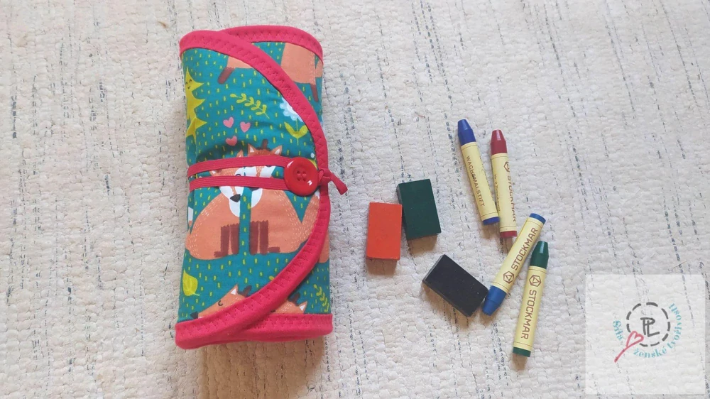 Penál se dá snadno stočit. Zapíná se na gumičku a knoflík. Penál se dá snadno stočit. Pastely se zasunují za elestický pásek, bločky do kapsiček. Penál je pěkně vypolstrovaný, aby dobře držel tvar a zároveň ochránil pastely a bločky.