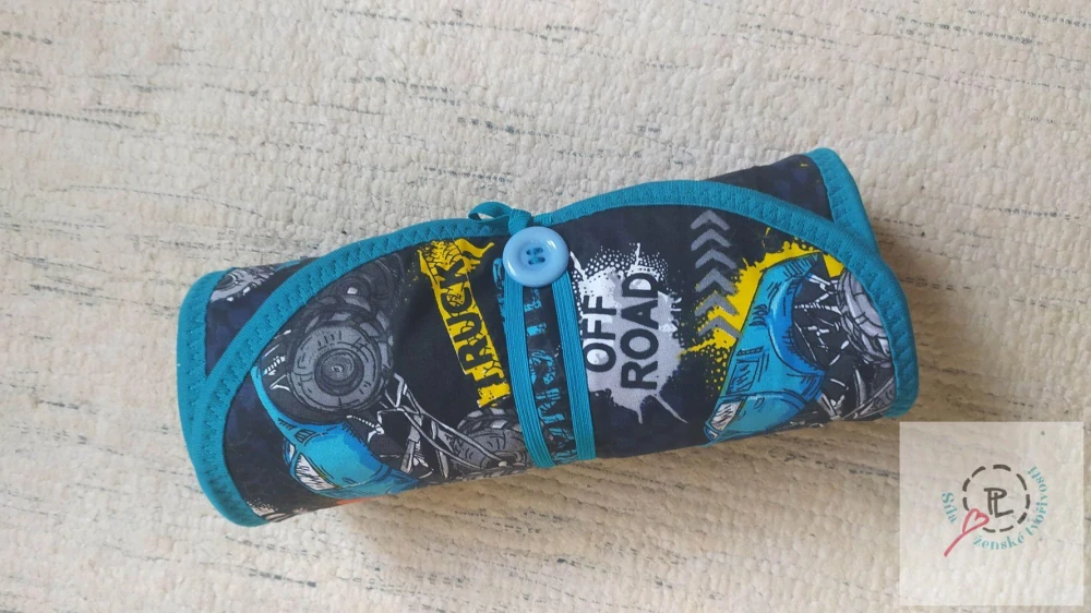 Penál se dá snadno stočit. Zapíná se na gumičku a knoflík. Pastely se zasunují za elastický pásek, bločky do látkových kapsiček. Penál je pěkně vypolstrovaný, aby dobře držel tvar a zároveň ochránil pastely i bločky.